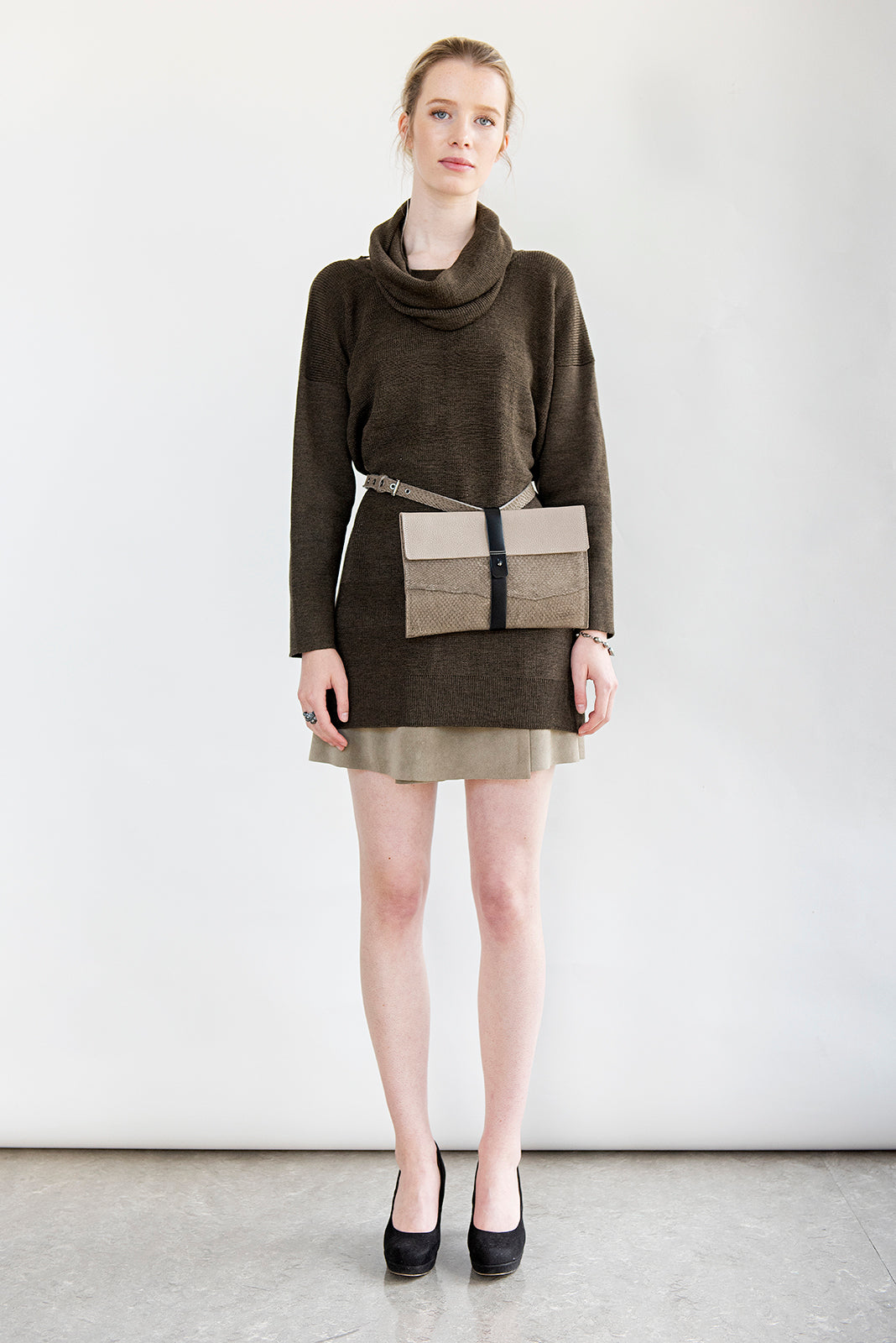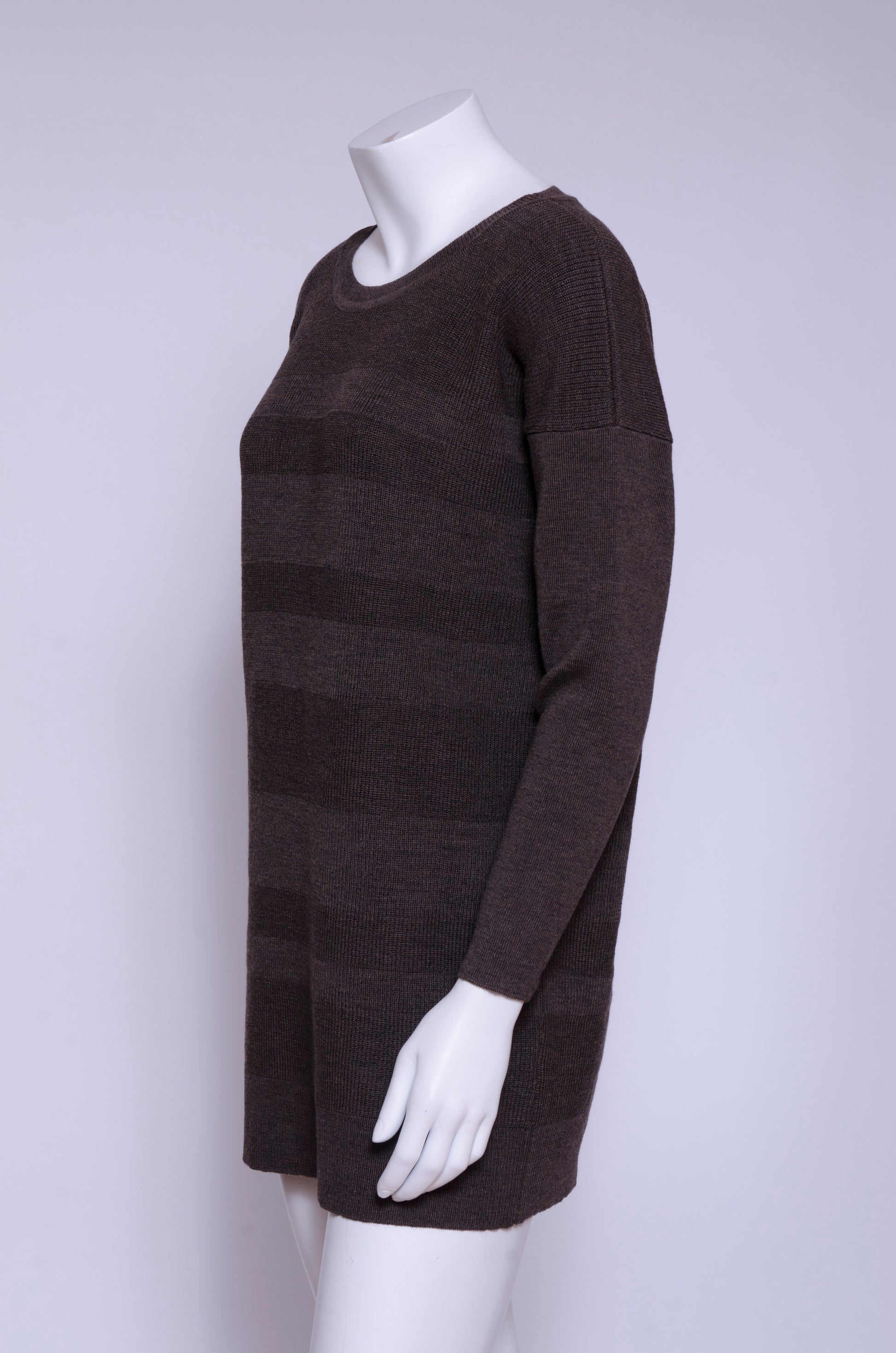 Mørck sin lange genser er strikket i tre forskjellige strikketeknikker som skaper en fin struktur i det melerte garnet. Genseren rekker til midt på kneet passer fint over bukser.