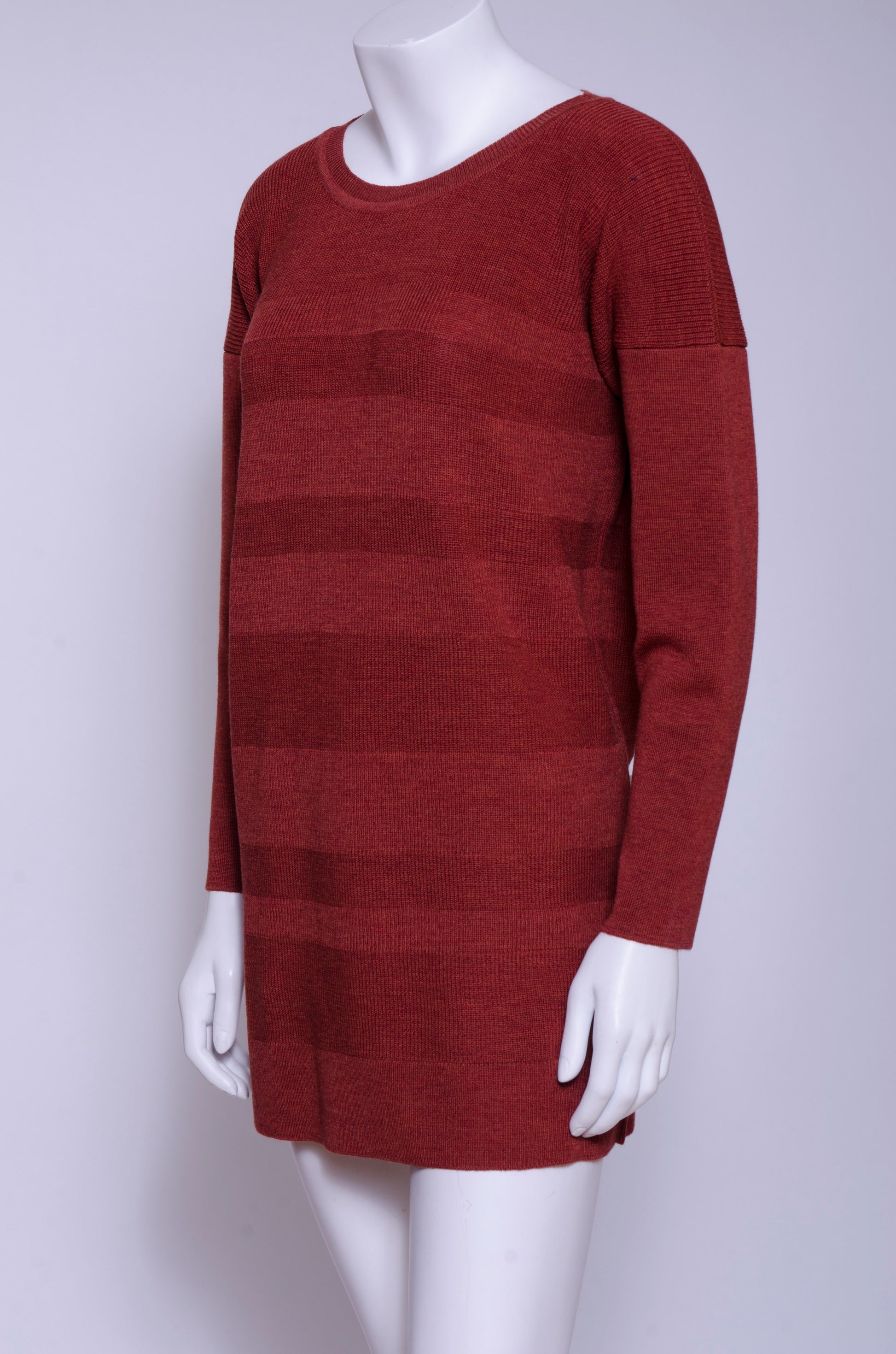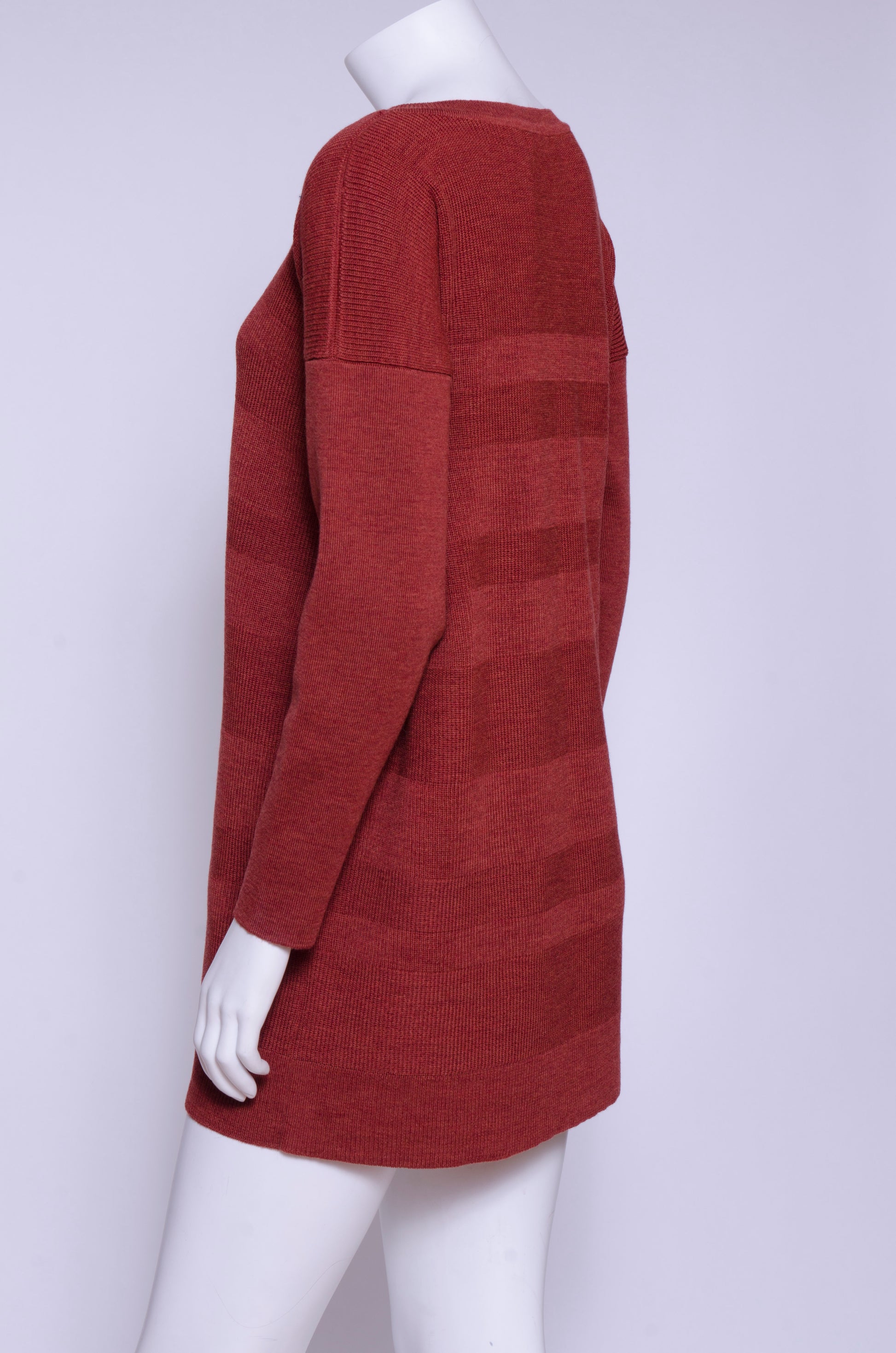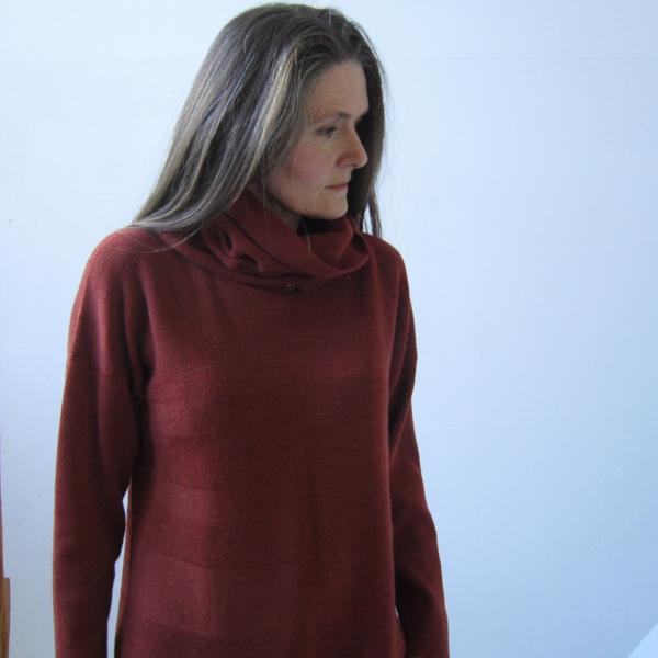 Mørck sin lange genser er strikket i tre forskjellige strikketeknikker som skaper en fin struktur i det melerte garnet. Genseren rekker til midt på kneet passer fint over bukser.