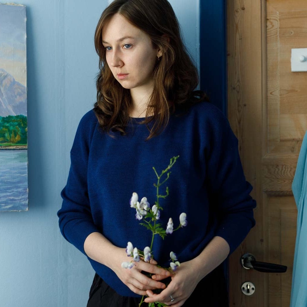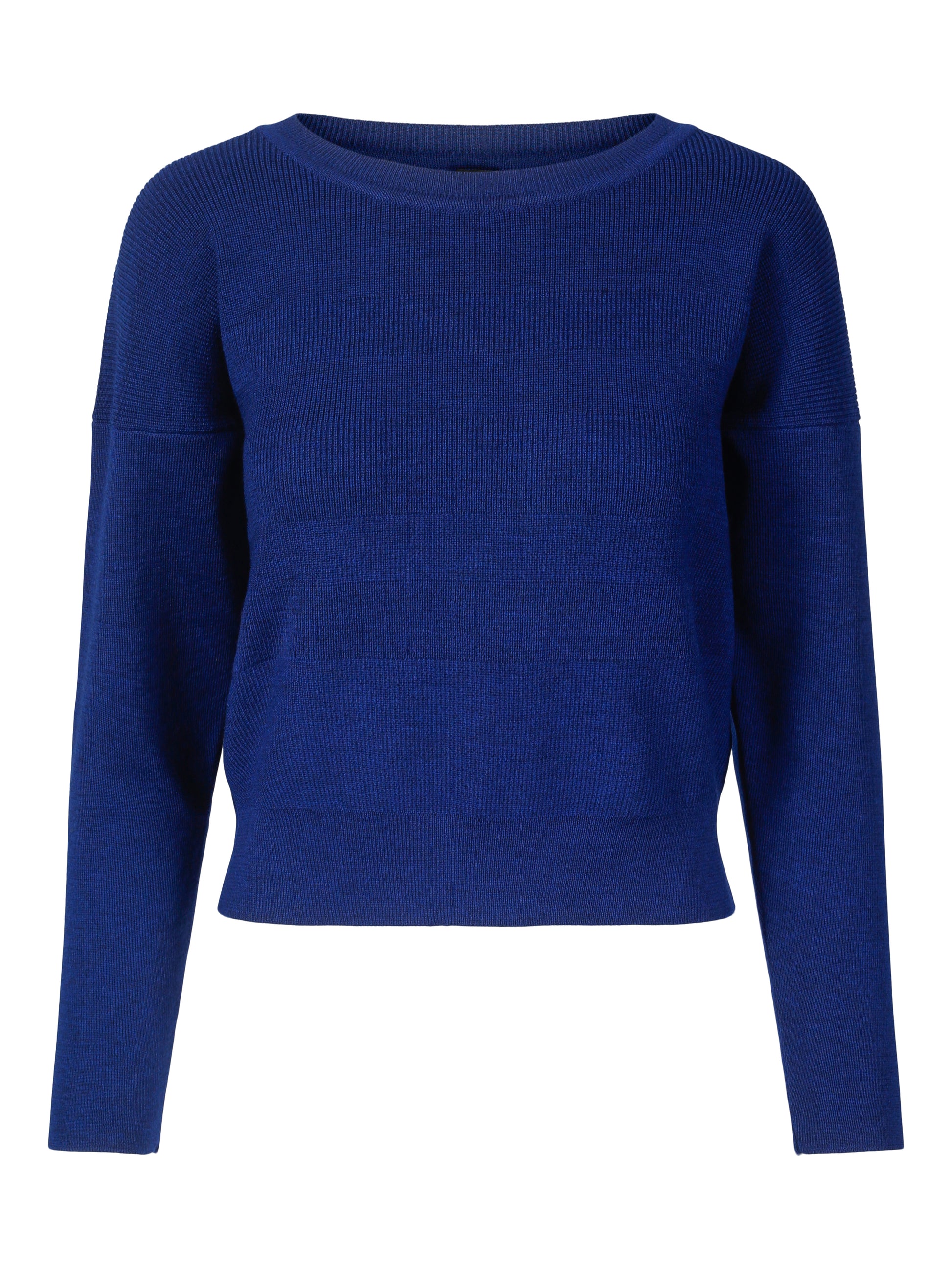 Mørck sin korte genser er strikket i tre forskjellige strikketeknikker som skaper en fin struktur i det melerte garnet. Genseren rekker til nedenfor midjen og passer fint sammen med skjørt og bukser med høyt liv.