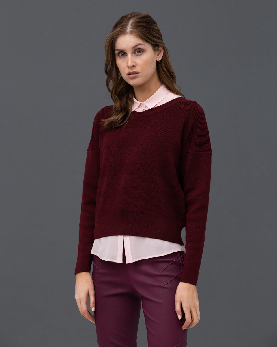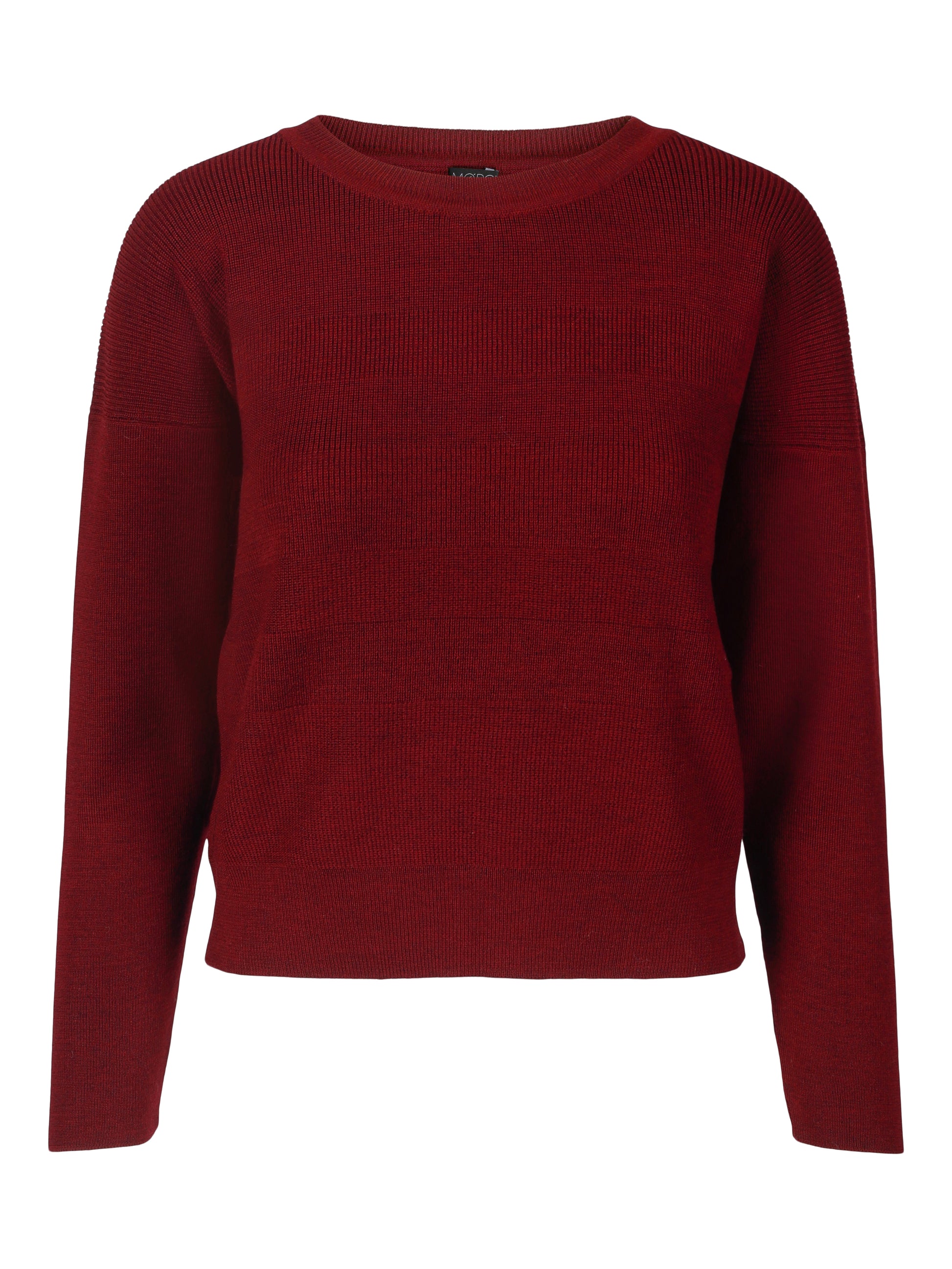 Mørck sin korte genser er strikket i tre forskjellige strikketeknikker som skaper en fin struktur i det melerte garnet. Genseren rekker til nedenfor midjen og passer fint sammen med skjørt og bukser med høyt liv.