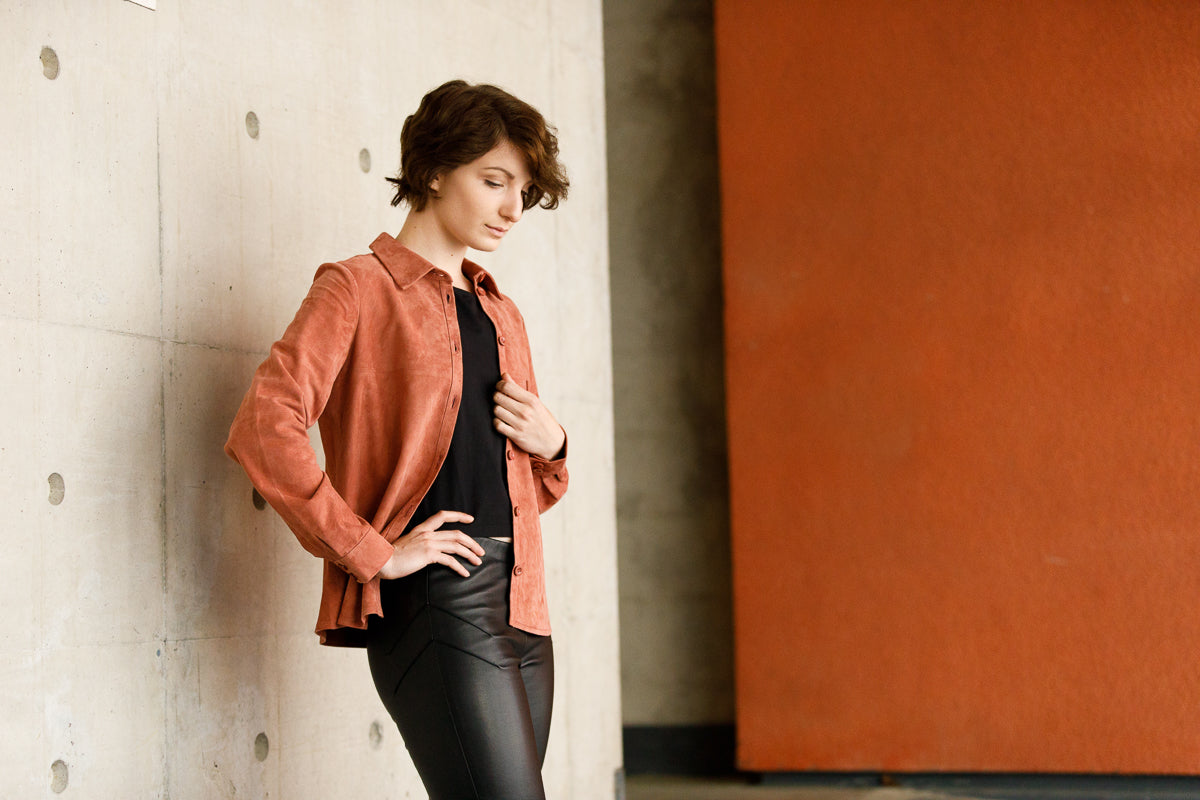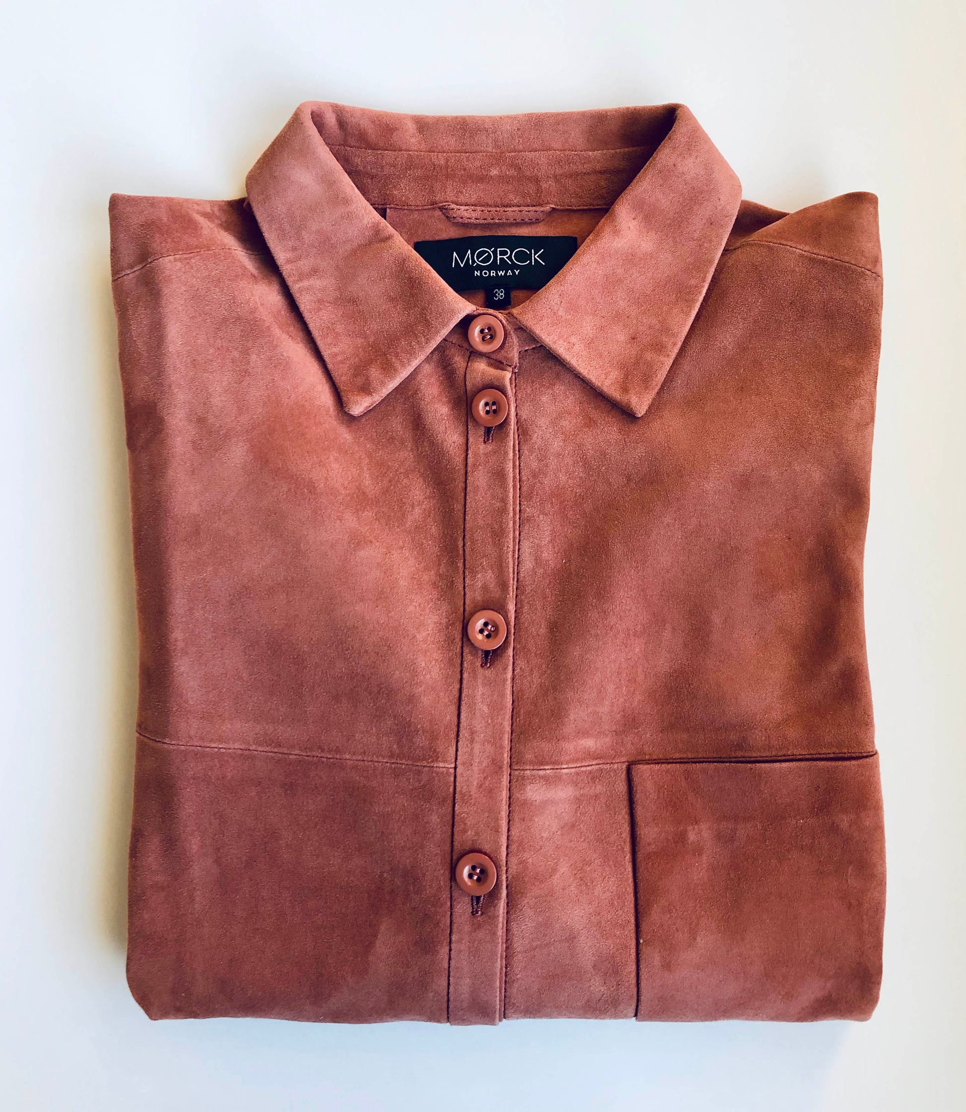 Line shirt in genuine suede leather with long sleeves and collar. The colour dark rose adds a sophisticated touch to your outfit. Discover the details as the pocket on the left side and the beautiful made button holes. Wear it with a leather trouser, a jeans or a skirt for contemporary business look.