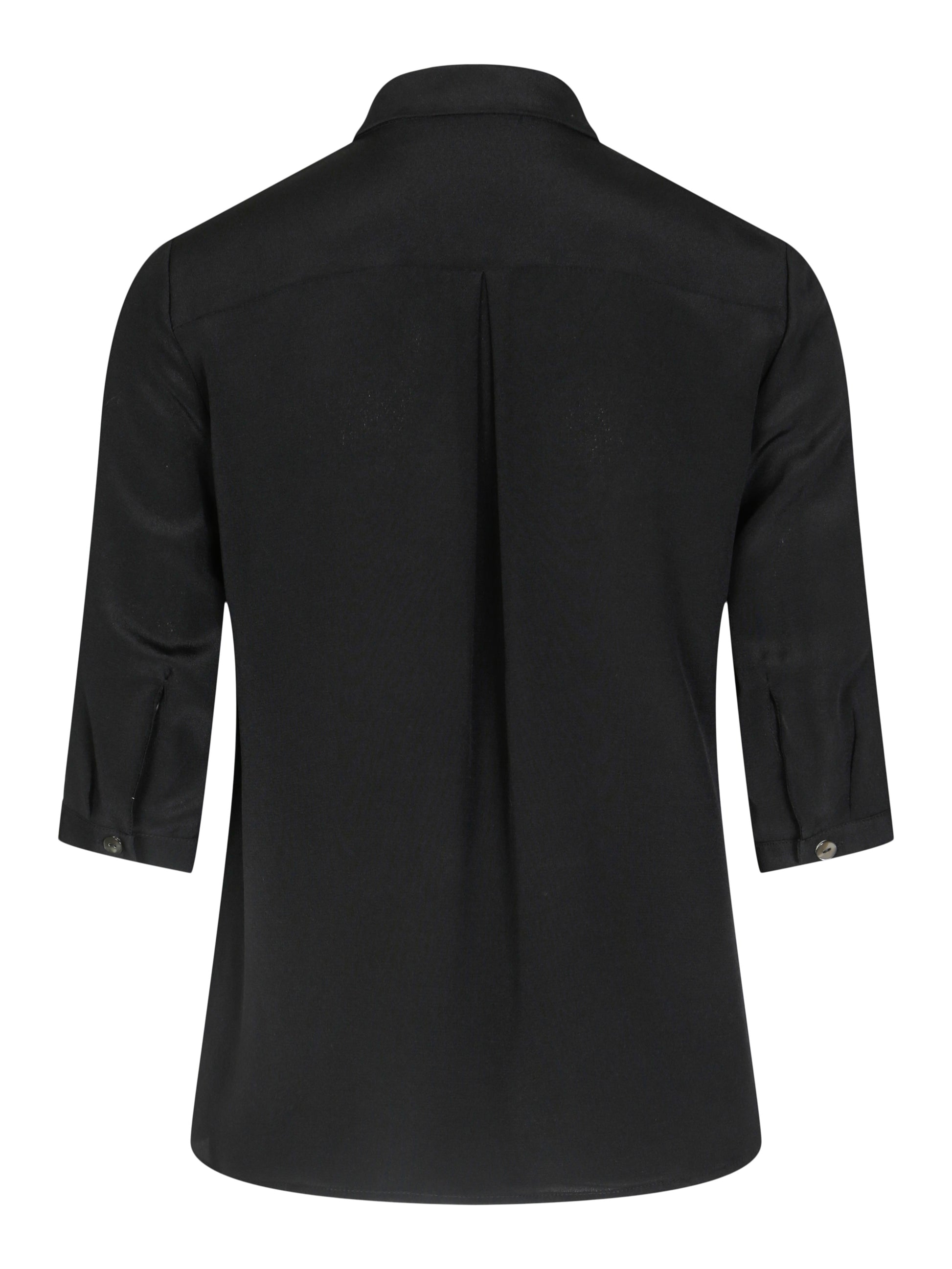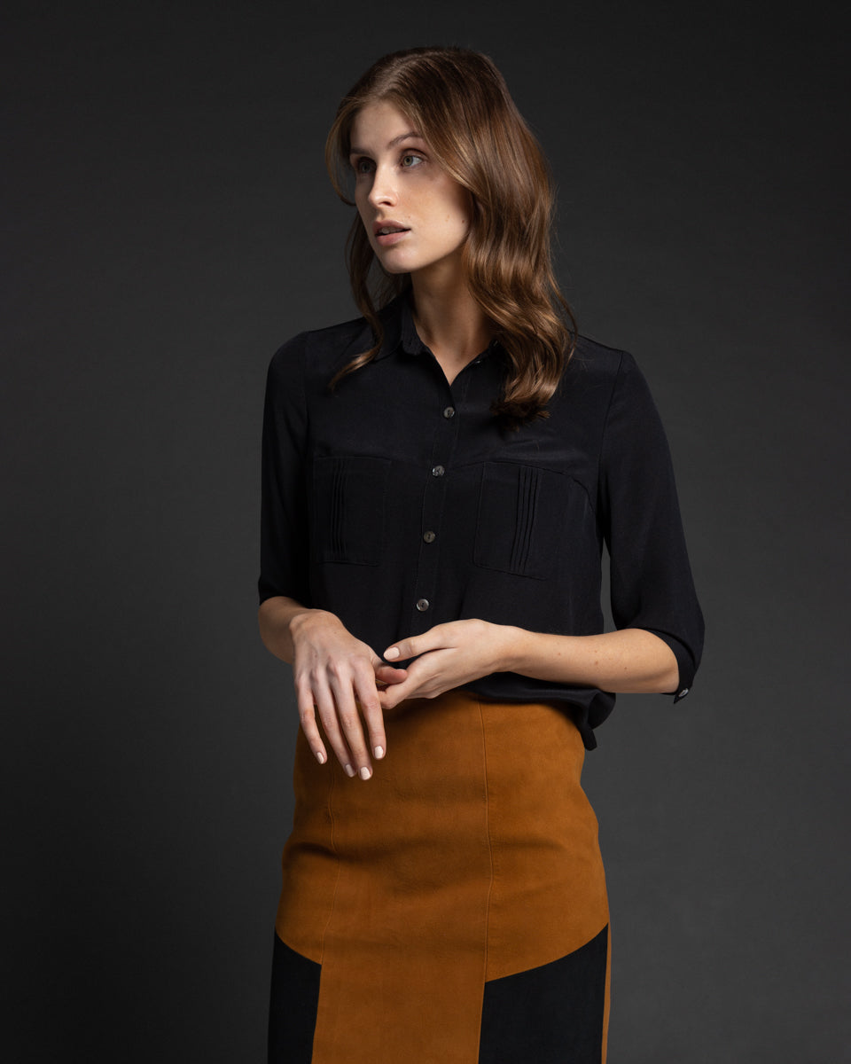 En klassisk bluse med krage og korte ermer i Italiensk silke. Perlemorknapper og biser på brystlommene. Splitt og knapp på ermene. Bærestykke med fold i ryggen som gir god passform.