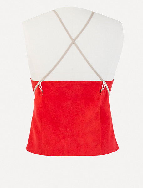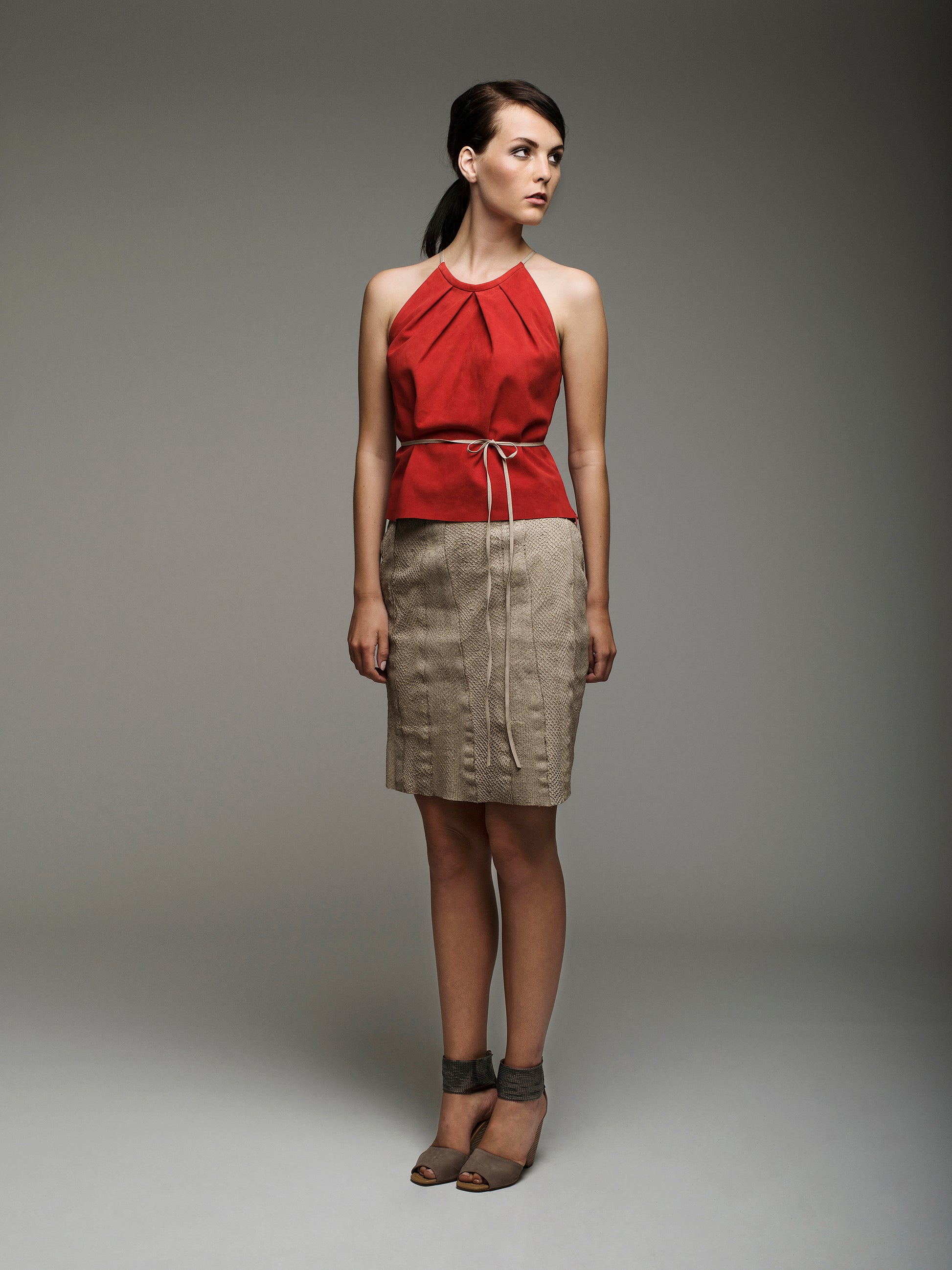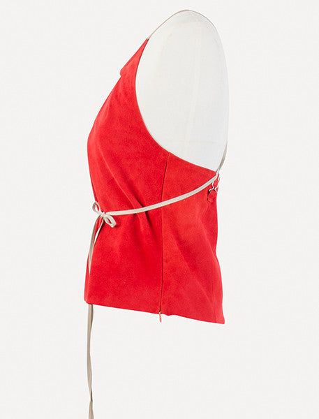 The top has a drawstring that goes through the neckline and is attached with corset clasps in the back. The string is beige and made out of silk and can be tied around the waist. With lining.