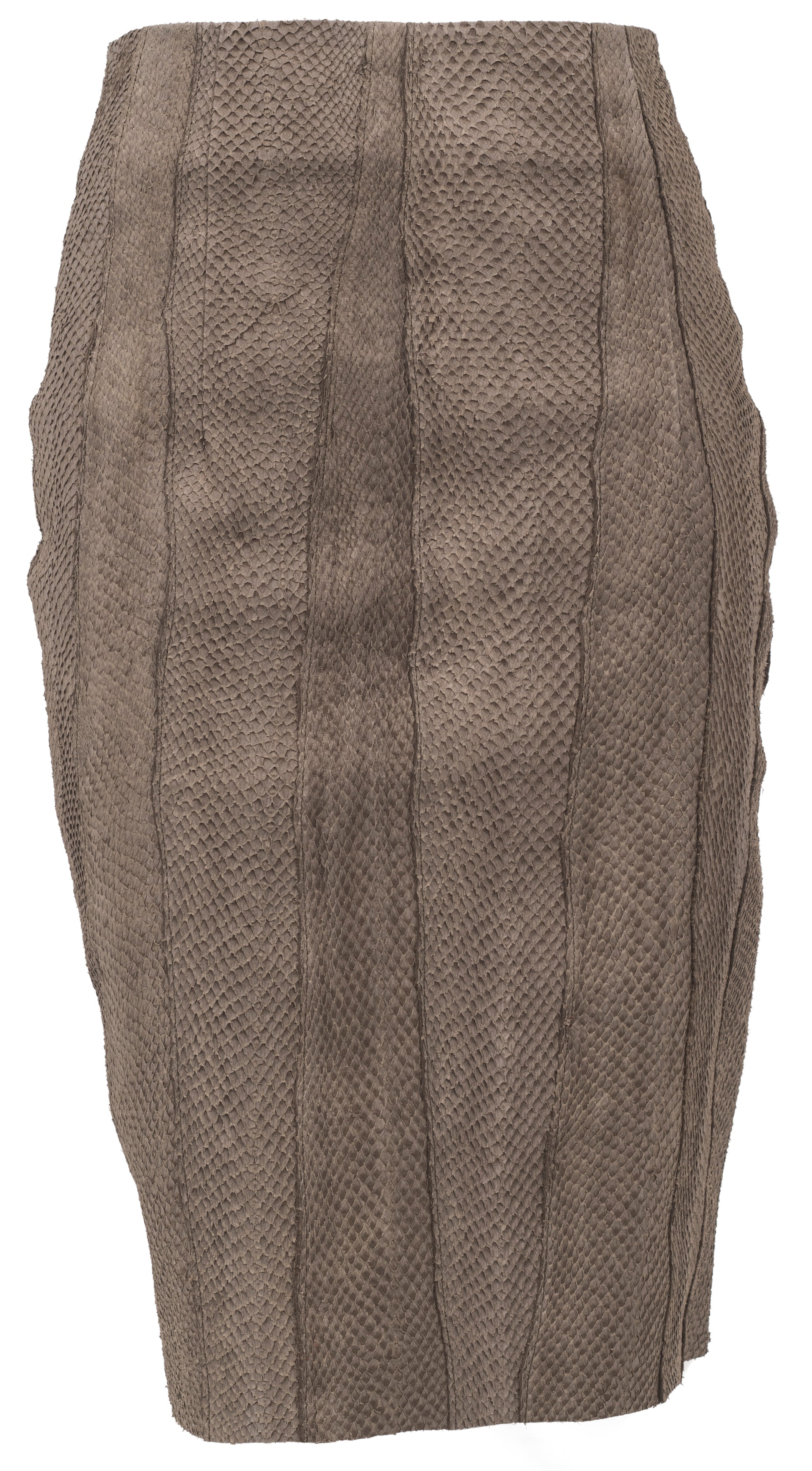 Skirt is made in suede salmon leather that is durable and comfortable. It is tight-fitting and will form to the body. Made without waistband, backside slit and lined. The skirt has to be cleaned regularly.